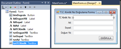 Proje açıldıktan sonra, doğrulama için web servisine gönderilecek olan bilgileri kullanıcıdan almak üzere aşağıdaki gibi bir form tasarımı yapalım.